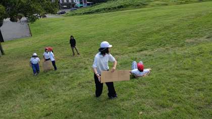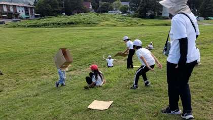 ダンボールを使って芝すべり体験。風が気持ちいい!