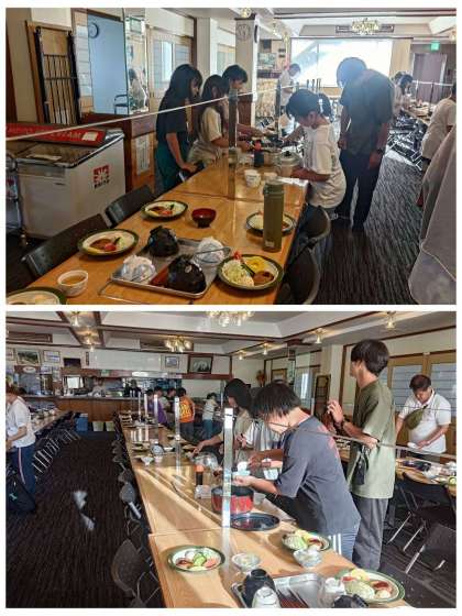 食事係はみんなより早く集まって、班の友達のご飯やお味噌汁の配膳をしています。