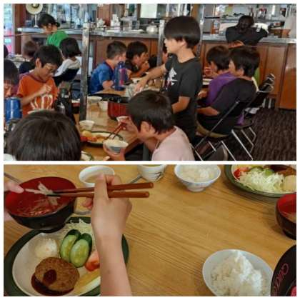 おいしいスープとおいしいおかず。お腹いっぱいになった後は、キャンプファイヤーへ!