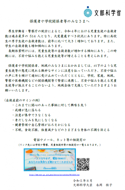 文部科学省を通じて厚生労働省より啓発活動の推進について依頼がありましたので、お知らせいたします。