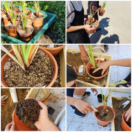 花しょうぶの植え替えを行いました。小さな鉢から大きな鉢へ植え替えを行い、肥料をあげました。11月頃にも肥料を追加する大事な役目もあります。