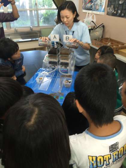 森の地層を再現した模型に汚れた水を流すと、きれいな水が流れてきました。