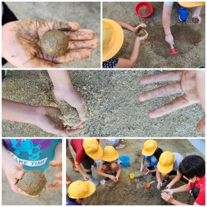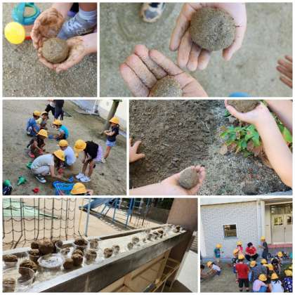 大きなだんごをつくる子、まん丸なだんごをつくる子、様々です。途中、土からミミズが出てくるハプニングもありましたが、「私ミミズ触られへんかったのに触れた!」とそぉっと花壇に返していました。