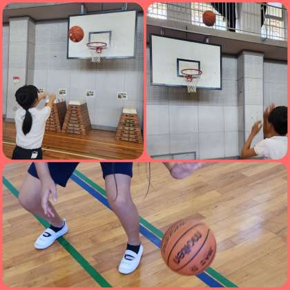 ウォーミングアップでは、バスケで必要な足の動かし方を学びました。その後は、ドリブルやシュートの練習をしました。「今日、教わったことをバスケするときに使お!」と言っている児童もいました。