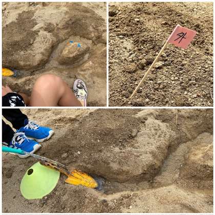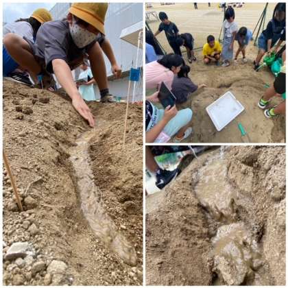 運動場の砂山を使い、自分たちで川を作り実験しました。