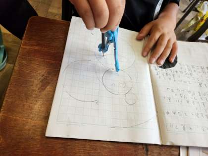 かきたい円の半径の長さに合わせてコンパスを開く、針をさす、少し傾けながら回す…初めてコンパスを扱う子どもたちにとっては難しいことだらけです。