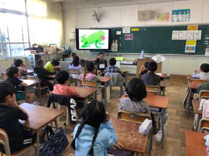 大宮中の英語の先生に来ていただき、外国語の学習をしました。1年生のときに学習した“color”のおさらいをし、動物当てクイズをしながら、様々な動物の英語での言い方を学びました。とても楽しくたくさんの動物を覚えることができました。