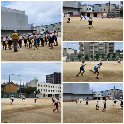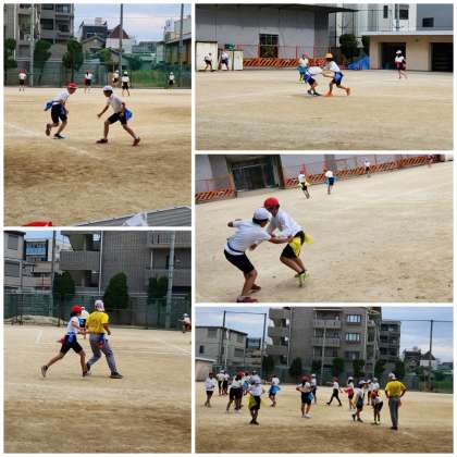 まずは、フラッグを取る動き、取られないように避ける動きを練習するために「フラッグ取りゲーム」を行いました。低学年の頃に行ったしっぽ取りを思い出しながら、楽しそうに活動していました。
