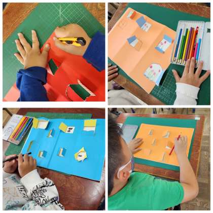 カッターナイフを上手に使って窓を作り、しろきタウンの建物を作っています。窓の形にも一人一人の工夫が見られます。