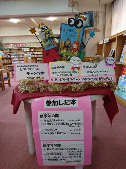 9月に図書委員会が実施したビブリオバトルの結果を、学校司書さんにかわいらしい掲示と共に発表してもらいました。決定したチャンプ本は図書室に置いてあるので、みなさんぜひ読んでみてください。