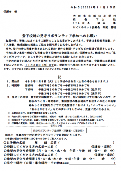 本日「登下校時の見守りボランティア参加へのお願い」という手紙を配付しております。3学期より、本校でも児童の登下校時の安全確保のため、保護者の方、地域の方々に「見守りボランティア」として、見守り活動にご協力をお願いしたいと存じます。