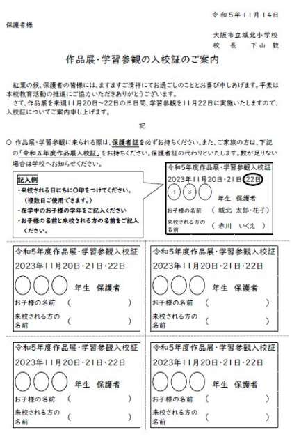 ご来校の際には、保護者証と上履き、下靴を入れる袋を忘れずにお持ちください。