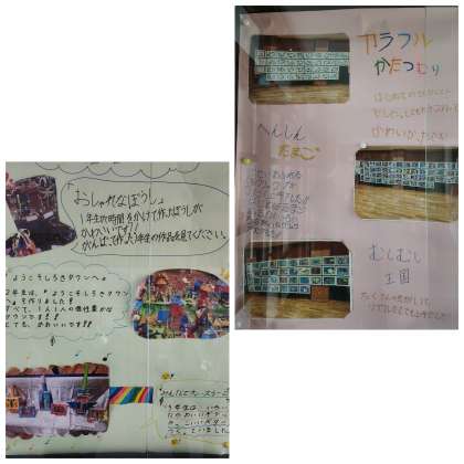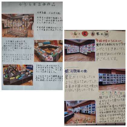 それぞれの学年の平面作品、立体作品それぞれの見どころや工夫を写真と共に紹介し、4枚の模造紙にまとめました。
