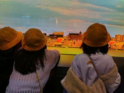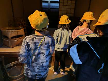 大阪の昔の町なみや、家の様子、使っていた着物や道具を見て、「昔の家の中って、こんなふうになっていたんだ。」「きれいな着物だな。」など、興味深そうにしていました。