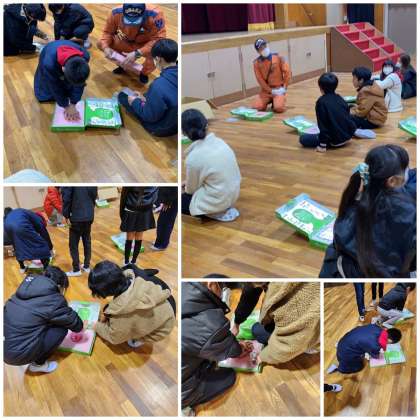 上手く胸骨圧迫ができると音が鳴る機械を使い、胸骨圧迫の練習をしました。なかなか音が鳴らず「難しいな」と呟く姿も見られました。