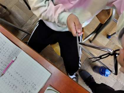 音とはどんな性質があるのか調べるために、音楽室からトライアングルやたいこを借りてきて、実際に鳴らして確かめてみました。