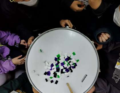 たいこの上に紙きれをまいて打ってみると、たいこの表面がふるえ、紙きれが跳ね上がる様子に歓声が上がりました。