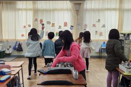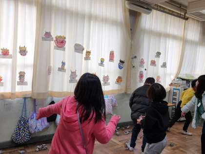 自分たちで描いた鬼の面と、新聞紙を丸めて作った豆で、豆まきをしました。