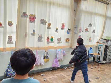 カーテンに貼り付けた鬼の面を見て、みんなワクワクした様子です。先生の「はじめ!」の合図で、鬼をめがけて、「鬼は外!」「福は内!」と元気な声をあげていました。