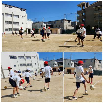 体を温めるために、リフティングの練習をしています。今日は日差しもあり温かいので、子どもたちはのびのびと活動しています。