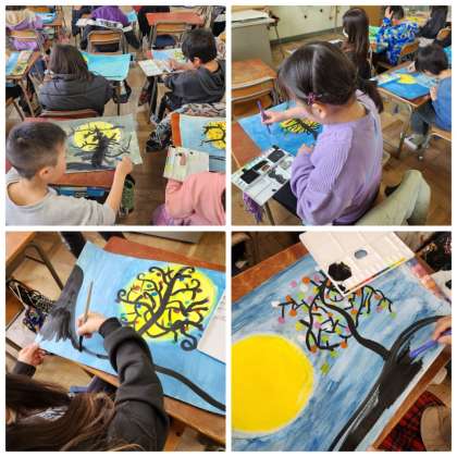 国語科で学習した「モチモチの木」を題材に絵を描いています。思い思いのモチモチの木の形や、夜の空の色、次の大きさ、山の形、そして明かりの色。同じお話を読んで学習したのですが、イメージする絵にはそれぞれの違いがあり、とても面白いです。