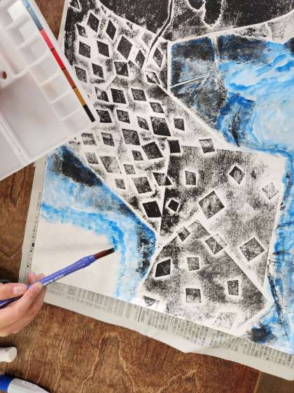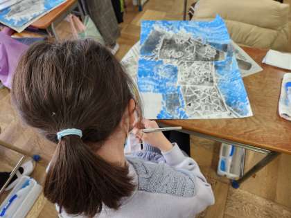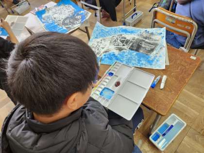 紙版画でつくった竜が飛ぶ空を絵の具で塗っています。ベタ塗りではなく点塗りで丁寧に塗り進めていて、自然なグラデーションや色の変化がとてもきれいに仕上がってきています。