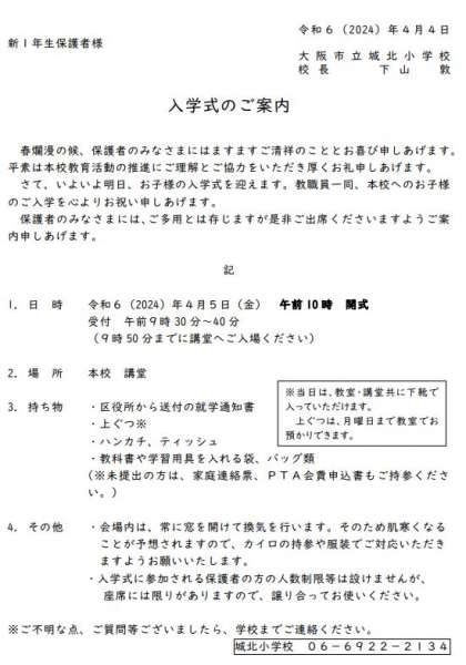 保護者受付は、9時30分〜40分の間に行いますので、受付時間内にお越しください。入学説明会の際にお配りした案内に、追記したものを添付しますので、ご確認をお願いいたします。