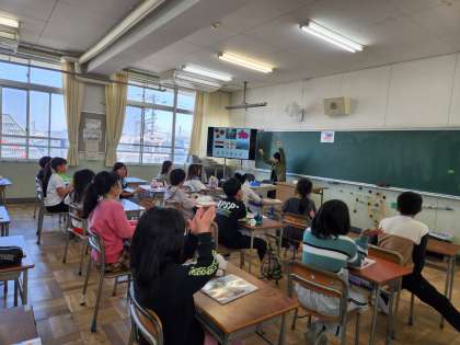 5年生から始まる外国語の学習では、週に一度C-NETのシスリー先生と一緒に学習をします。昨年度までも、外国語活動の時間に何度か一緒に勉強をしてきたのですが、改めて自己紹介をしてもらいました。