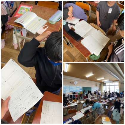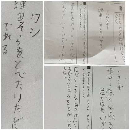 はじめに自分の考えた動物とその理由を書いてから交流します。マグロやワシ、ハムスターなど個性あふれる動物が出ました。