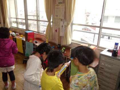 理科で使った空気でっぽうを使って、100点や50点と書かれた的を倒します。