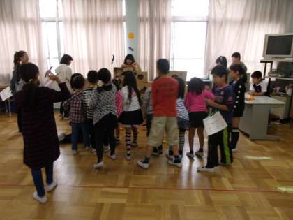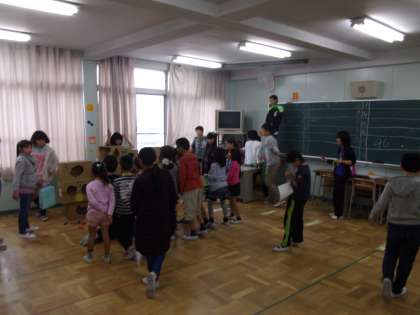 お店の内容は、教室中に散らばっている紙で作ったキャンディーを拾い、