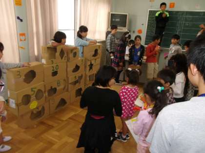 難しい場所にキャンディーが入ると、お店当番の人がほめてくれ、入った子どもはとても喜んでいました。