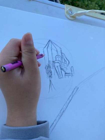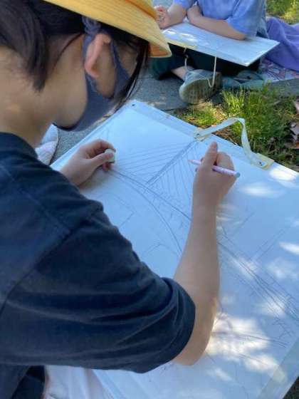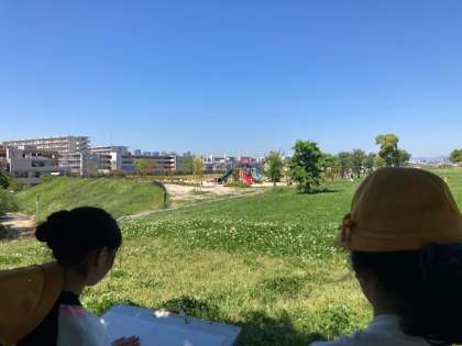 淀川河川敷に写生会に行きました。子どもたちは、自分の描きたい場所を選び、真剣に作品作りに取り組んでいました。