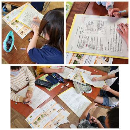 来週5年生は、はじめての調理実習に挑戦します。実習のグループに分かれて、調理の手順を確認したり、役割分担を話し合ったりしました。