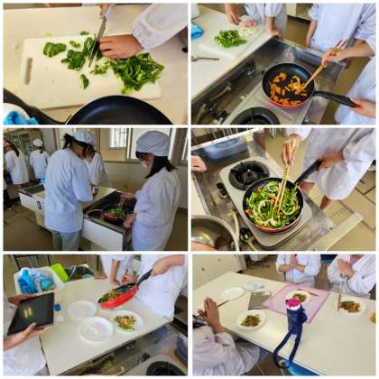 栄養バランスのよい朝食をとるために、不足しがちな野菜を使った料理を作ろう、というめあてで、「いろどり炒め」を作る実習を行いました。
