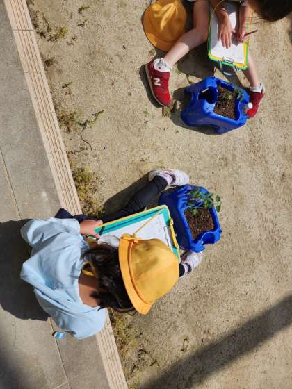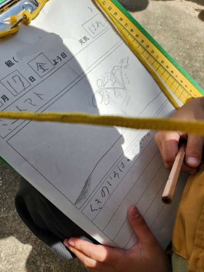 葉の形や、茎の色など苗をよく観察して絵を描いたり、記録をしたりしました。