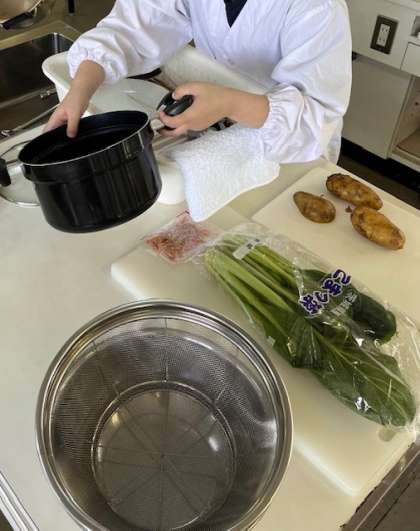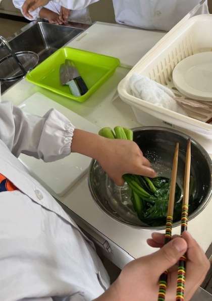5年生は、調理実習で「青菜のおひたし」と「ゆでいも」を作りました。
