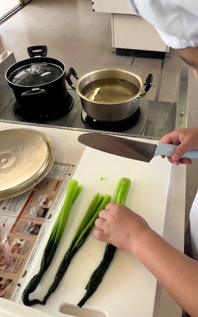 初めての調理実習で、楽しみと緊張が混じった様子でしたが、準備から片付けまで班で協力し、手際よく取り組むことができました。