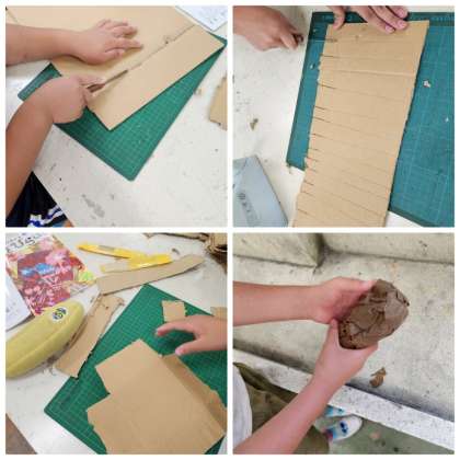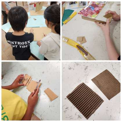 ダンボールを組み合わせて工作をしています。濡らすとダンボールがきれいに剥がれることを利用したり、丸めたり、折ったりして、思い思いの作品を作っていました。