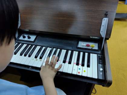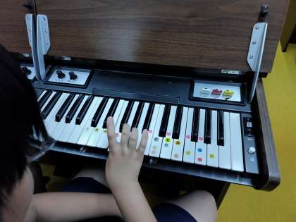 3年生の音楽科は、音楽室で行っています。「歌って音の高さを感じ取ろう」の単元では、音楽室のオルガンを使って、音の高さを確かめながらの演奏に挑戦しました。