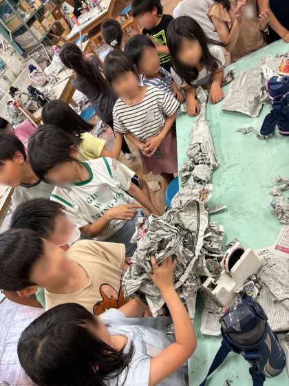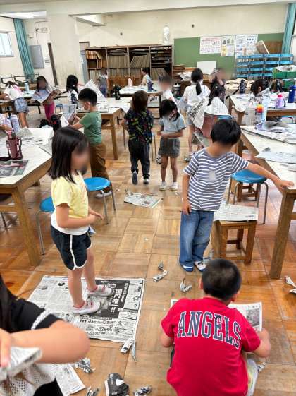 図画工作科で、体全体を使って新聞紙を味わう学習をしました。