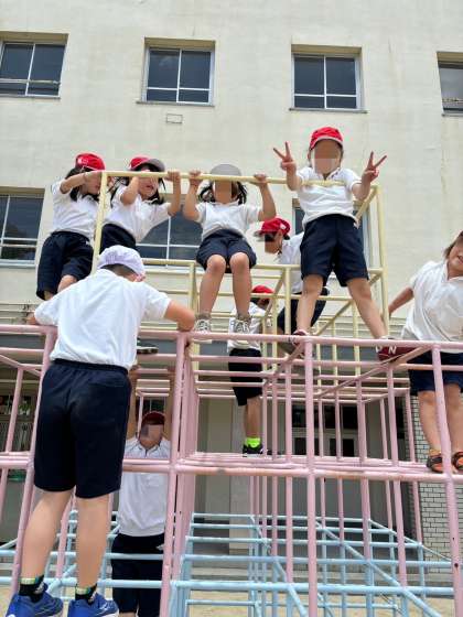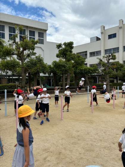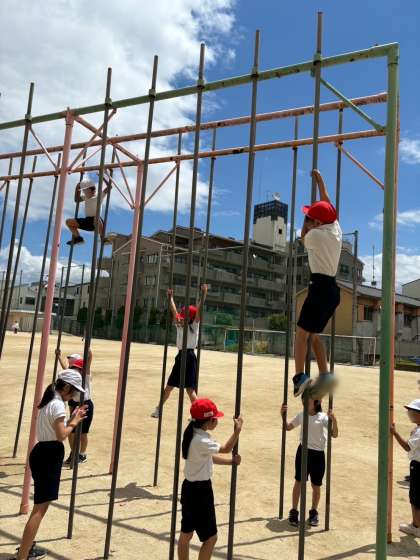 学校にある固定施設であるのぼり棒、うんてい、ジャングルジムなどを使った運動をしています。