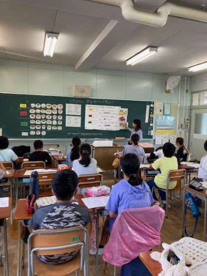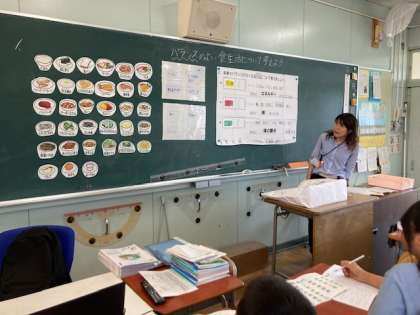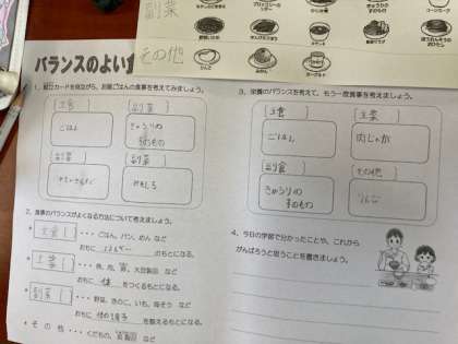 今日は、大宮小学校から栄養教諭の藤井先生に来ていただきバランスのよい食生活について学習しました。主食、主菜、副菜という視点で献立を見直し、バランスのよい献立を考えました。