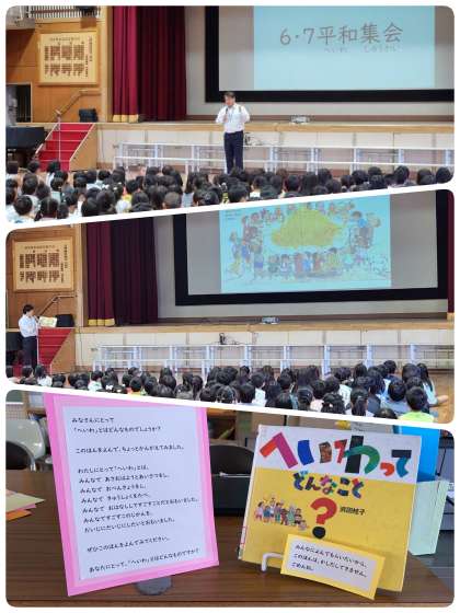 今年は、校長先生や人権主担の話、「へいわってどんなこと?」の絵本の読み聞かせを行いました。争いのない平和な世界にしていくためには、一人ひとりが平和について考え、想いをつないでいくことが大切です。集会の他にも、学年に合わせた平和学習も行い、それぞれの立場で平和について考えていきます。みなさんにとって、「へいわってどんなこと」ですか。