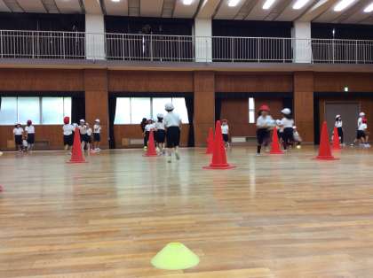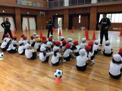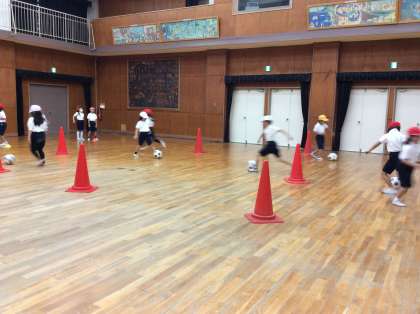 2時間目の体育は、セレッソ大阪のコーチをお招きしてサッカーの夢授業をおこないました。あいにくの雨でしたが子どもたちは講堂で元気いっぱいドリブルをしたり、コーンの周りをまわったりして学校では初めて触れるサッカーに親しみました。