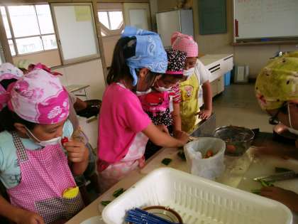 子どもたちはピーマンを切ったり、にんじんの皮をむいたりしました。