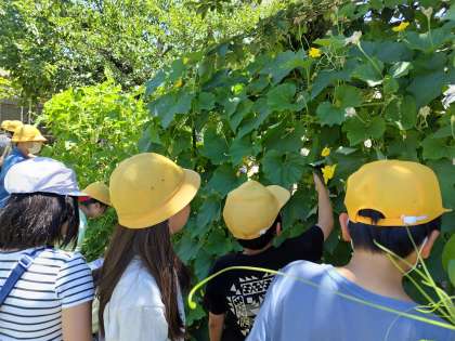 「葉が私の手よりも大きいよ。」「ヘチマ、さわってみていい?」「ヒョウタンはつるつるな感触だね。」と、多くの感想をつぶやいていました。こちらが何も言わなくても、雑草をとるなどもしていました。