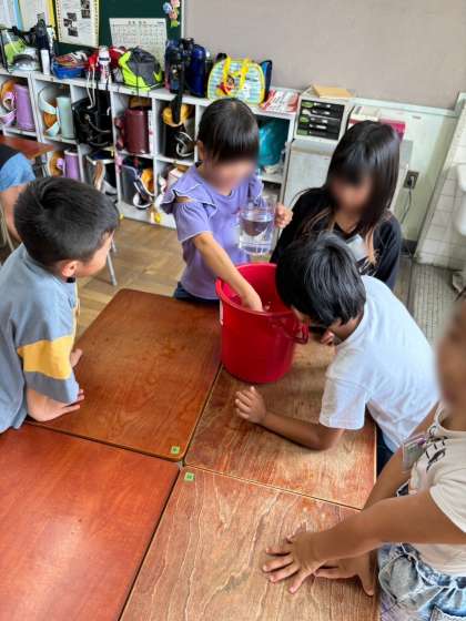 今日は、実際に水とますを使って、体験的に水のかさがとのくらいか学習しました。