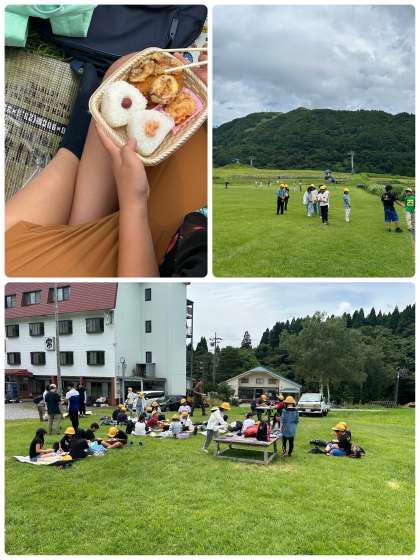昼食まで少し時間があったので、芝生でおにごっこをしたり、バッタを捕まえたりして遊びました。