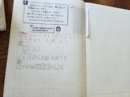 公約数を考え方を活用して解く問題に挑戦しました。12と18の公約数を求めるスピードがとても早く、今日までの学習がきちんと身についているようです。